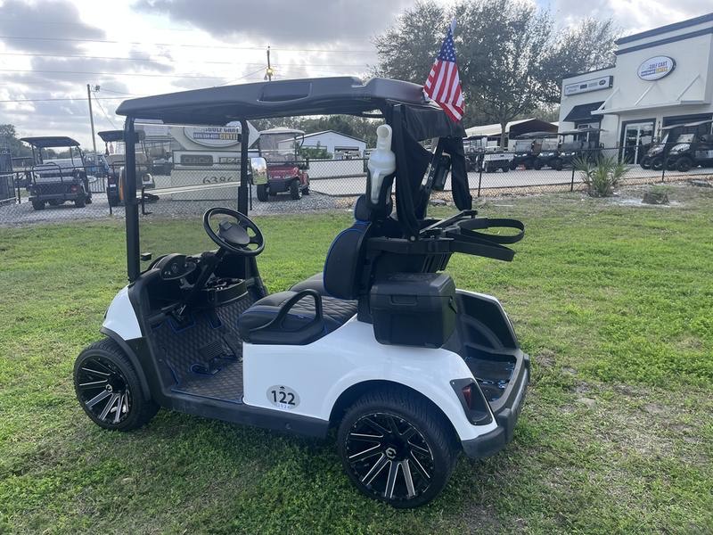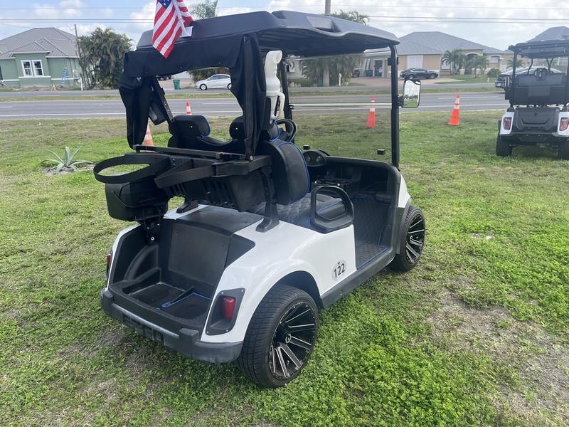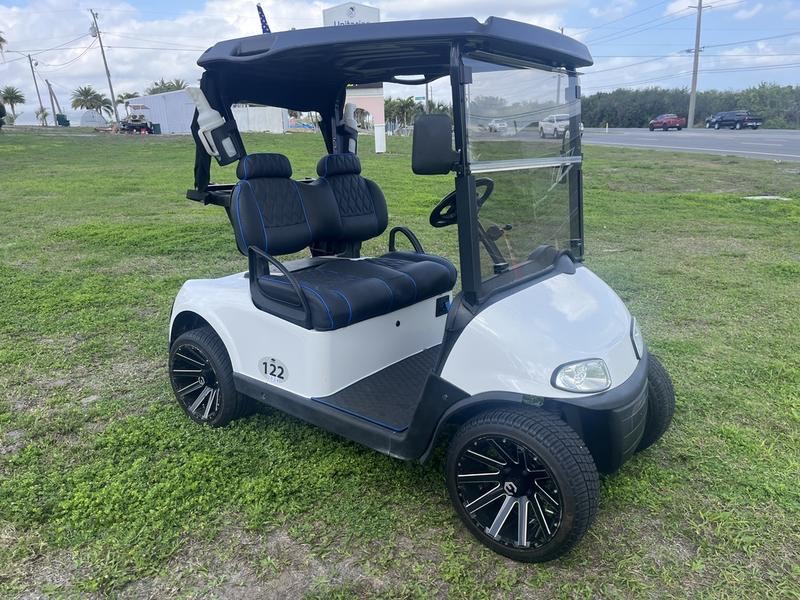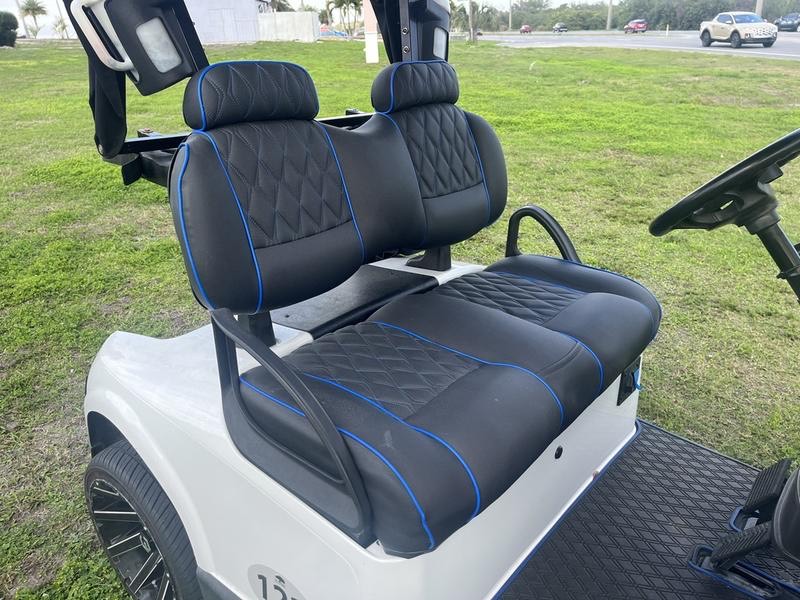 Upgrade your ride with this custom Club Car golf cart, featuring luxury diamond-stitched seats, sleek 14” black alloy wheels, and a high-gloss white body. Perfect for the course, community, or cruising around town with premium comfort and style.